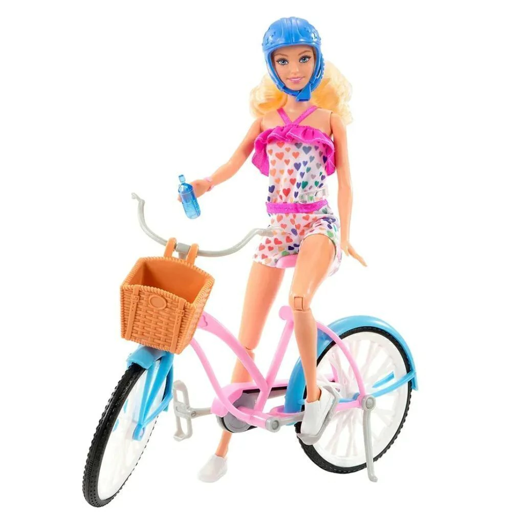 Disfruta de una increíble aventura con la muñeca Barbie y su bicicleta. Esta bicicleta está diseñada en hermosos tonos de rosa y azul, con detalles plateados y una canasta, lo que la convierte en el escenario perfecto para crear todo tipo de historias emocionantes. Los pedales y las ruedas funcionales hacen que montar en bicicleta sea fácil y divertido: simplemente coloca a la muñeca Barbie en el asiento, sujeta el manillar y empuja. La muñeca Barbie está diseñada para doblarse en las caderas, rodillas y brazos, lo que le permite manejar la bicicleta de manera fácil y realista. Con su mono superbonito adornado con volados y un estampado de corazones de arcoíris, está lista para cualquier aventura que te imagines. Además, incluye accesorios como un casco y una botella de agua que caben perfectamente en la canasta de la bicicleta, para que puedas divertirte mientras viajas.