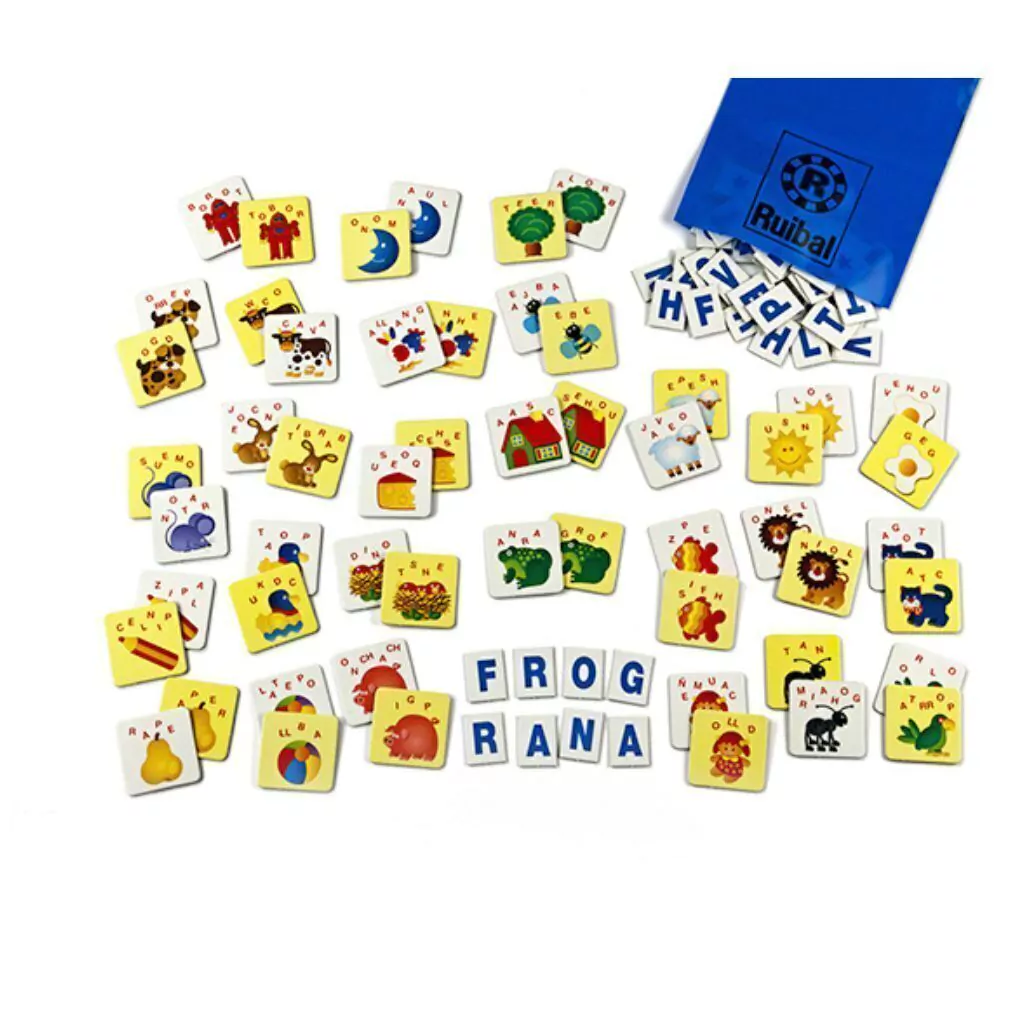 Contenido: 27 fichas en idioma español, 27 fichas en idioma inglés, 112 fichas con letras.