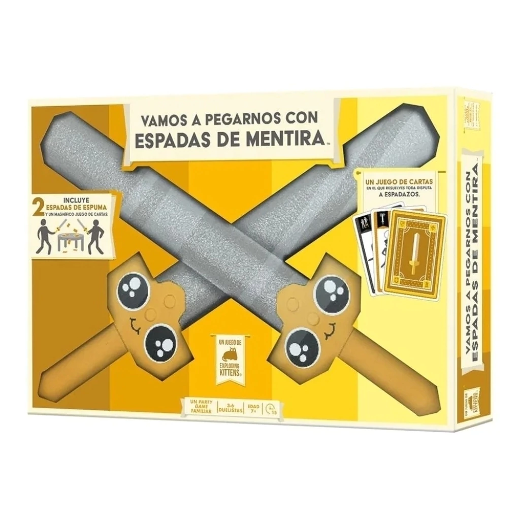 Vamos a luchar a ESPADAZO LIMPIO. Vamos a pegarnos con espadas de mentira es un Party Game familiar para 3-6 duelistas con partidas de unos 15 minutos. Este es el primer juego de cartas de la historia en el que te pelearás por conseguir cartas atizando a tus adversarios con una Espada de espuma... tal y como harían los adultos. Consigue 3 cartas del mismo color para formar un conjunto. Si eres la primera persona en conseguir 3 conjuntos de cartas, ¡ganas la partida!